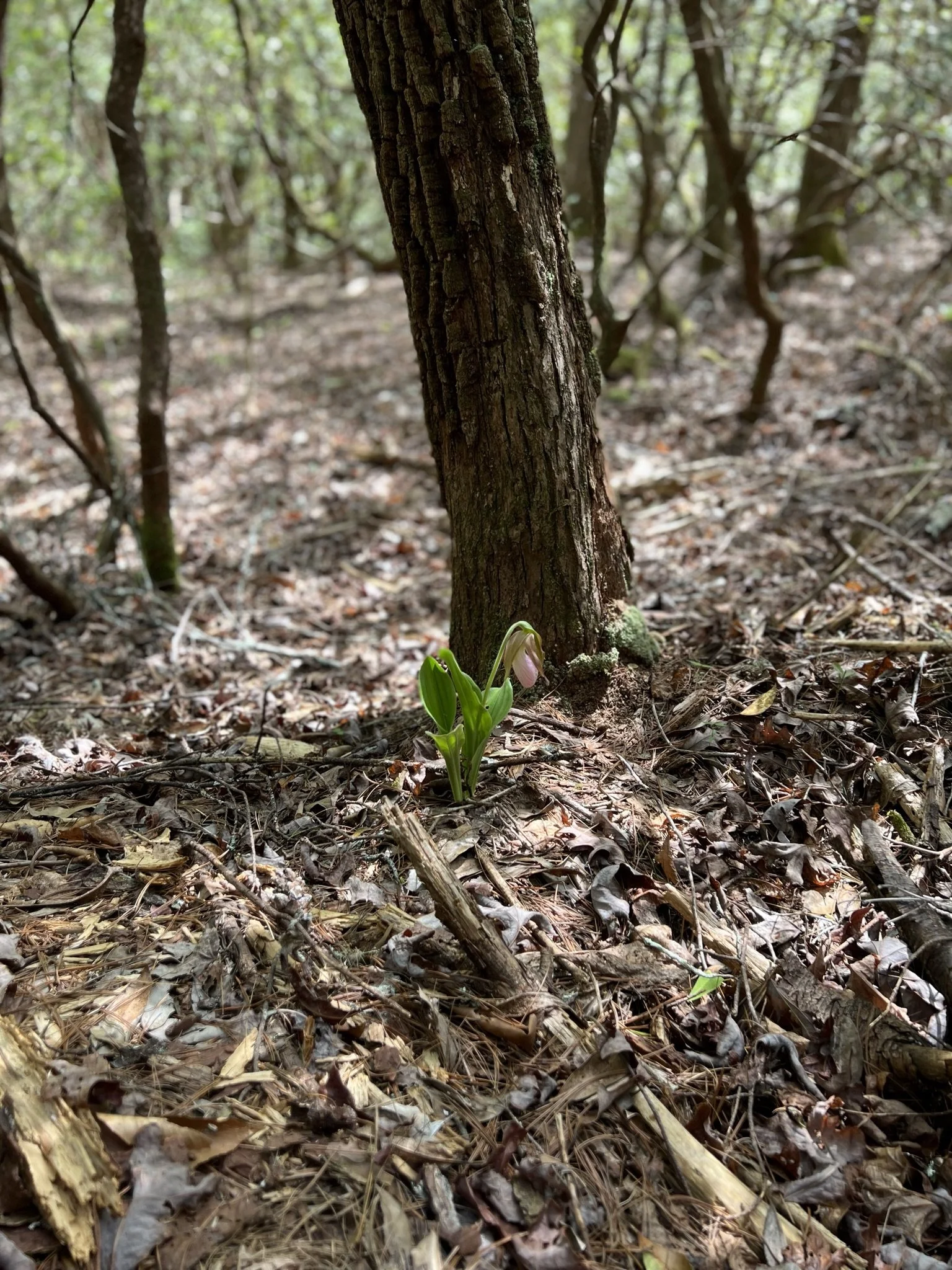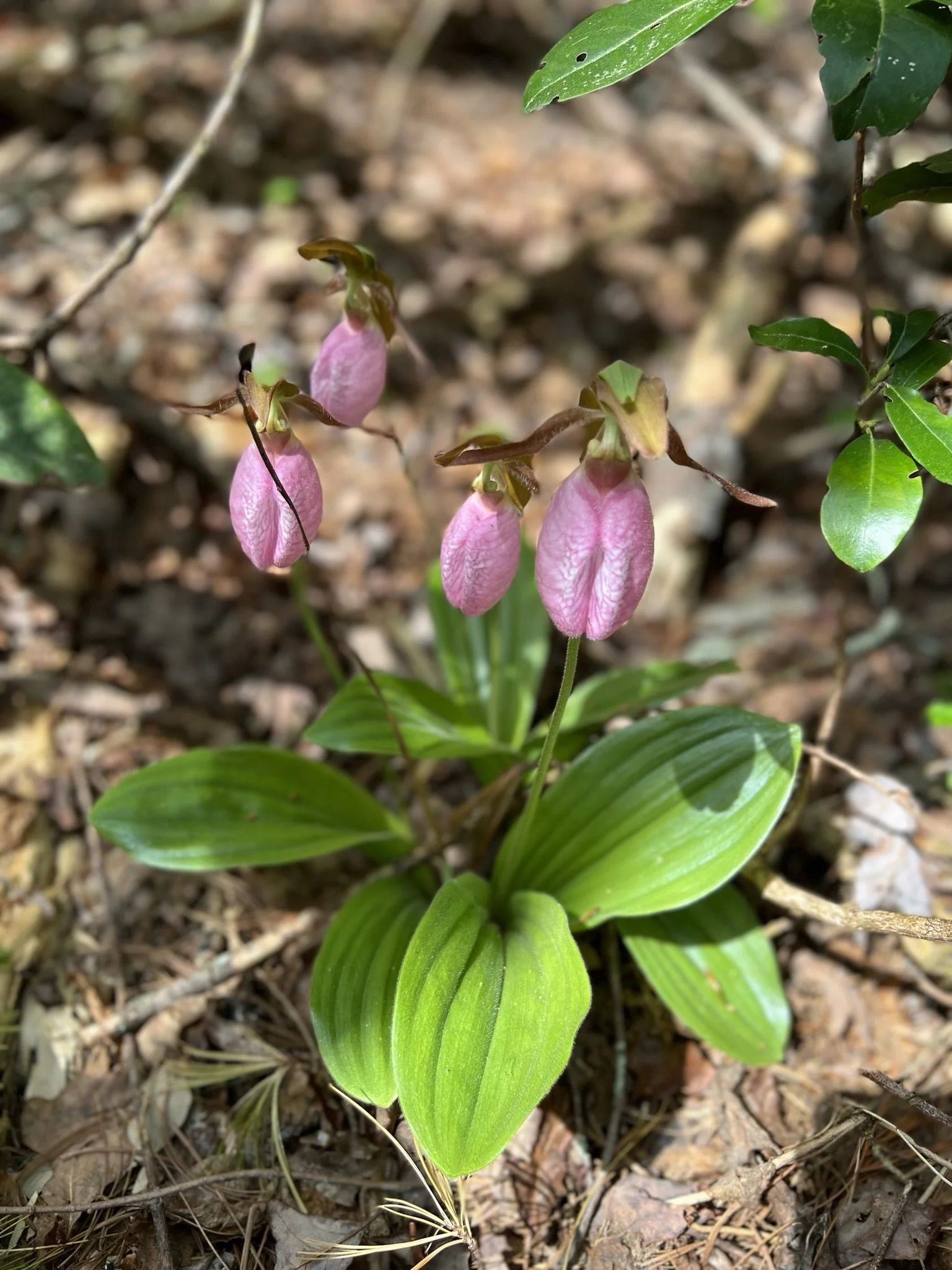On a wellness walk in late April a few years ago, we stumbled upon the most alluring splash of color blooming at the base of these giant pine trees. We came to discover several stands of Pink Lady Slippers, a rare nearly endangered species of native orchids, quietly flowering in the western slope of Taliama.